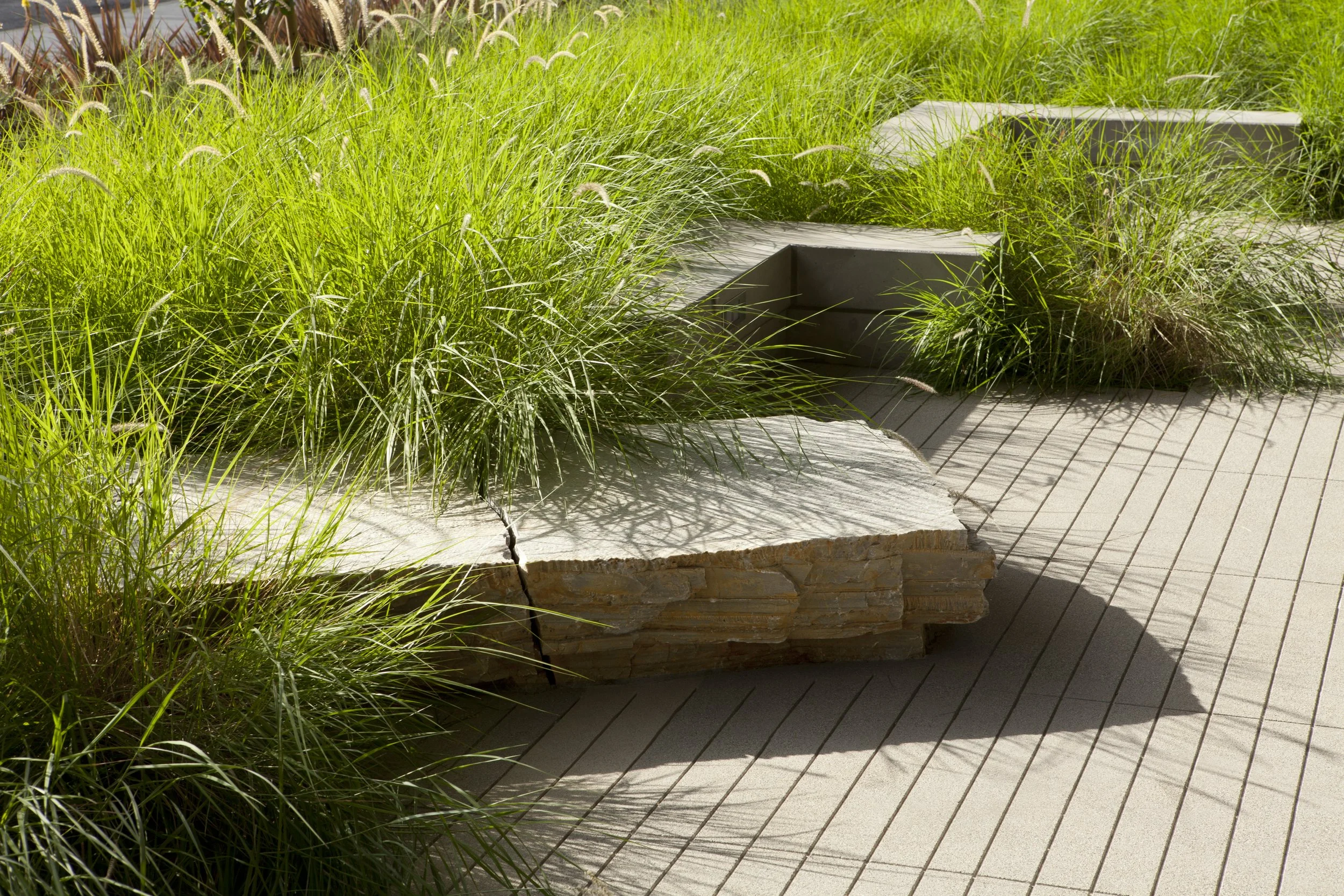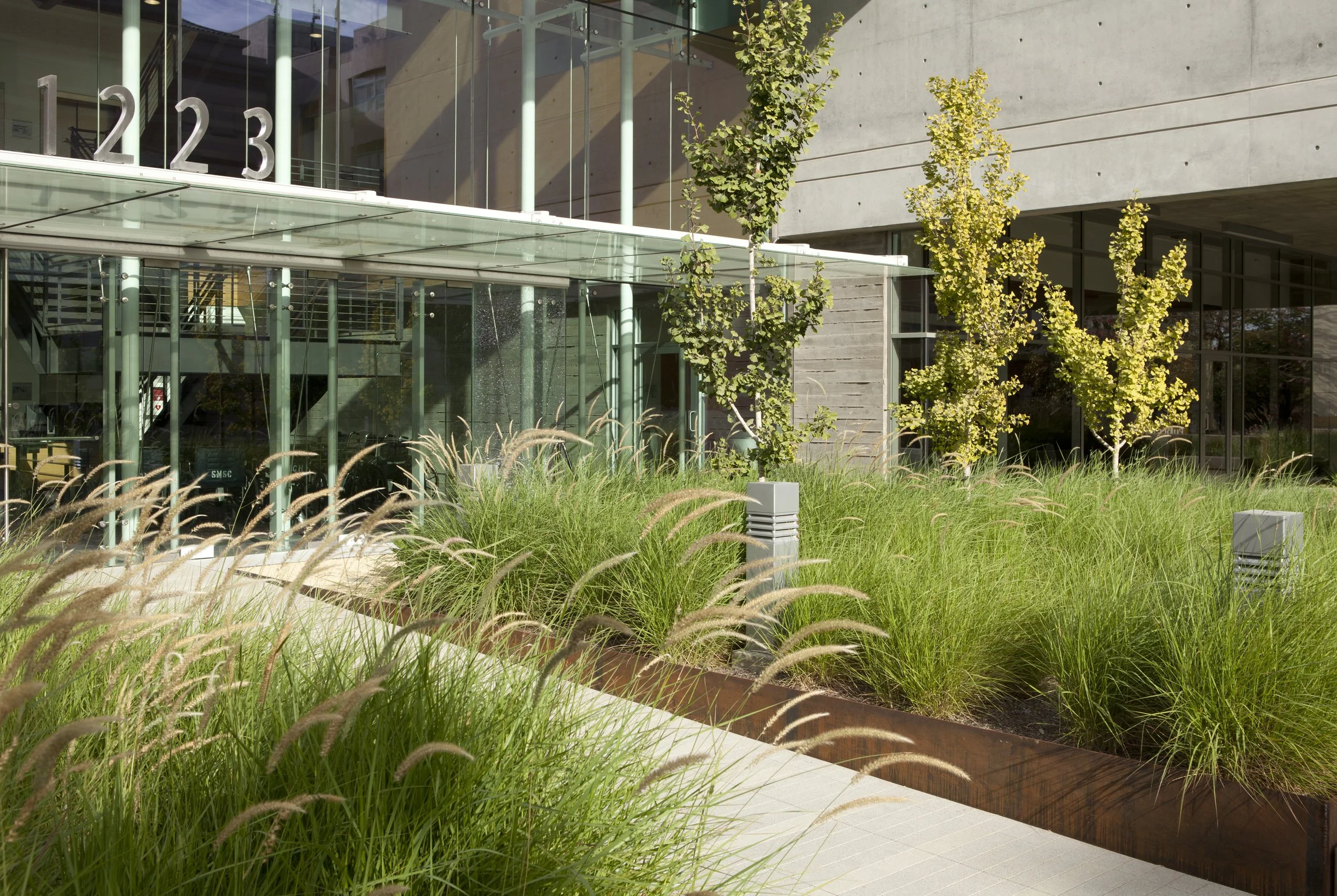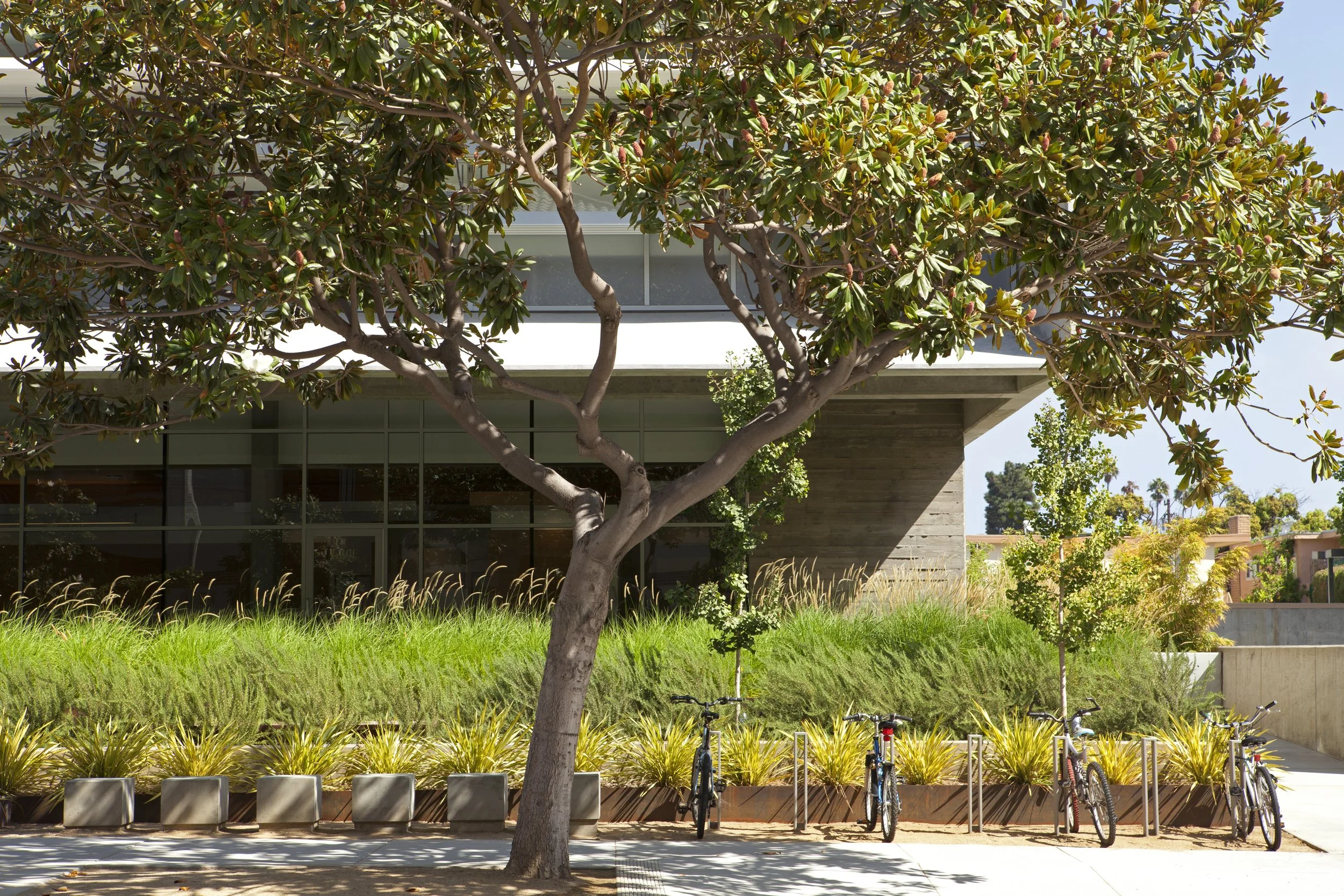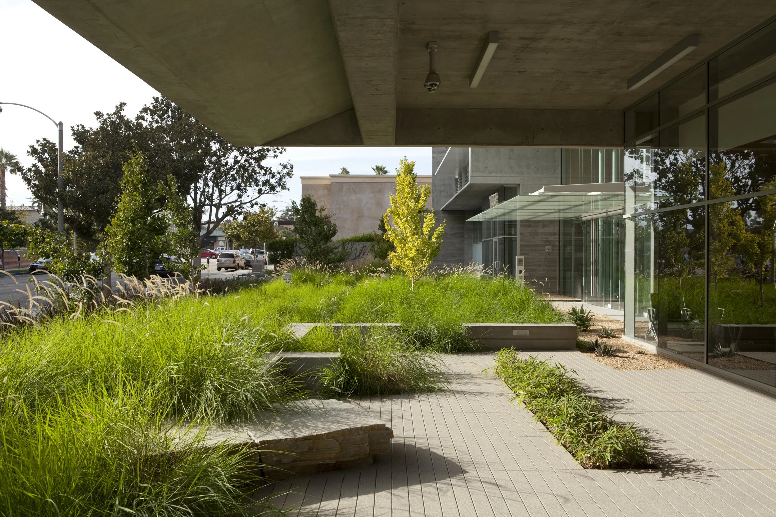 The landscape at the 16th Street Medical Office Building blurs the boundaries between indoor and outdoor spaces, offering soothing and therapeutic landscapes within patient recovery areas via sustainable, low cost and low maintenance materials. As the first LEED Gold Certified outpatient surgery and oncology center in the nation, the design focused on durable, low water use materials that thrive in Santa Monica’s Mediterranean climate. Inert groundcover of locally quarried stone and an efficient, low water use irrigation system support elements that engage the public realm and weave public and medical environments together.