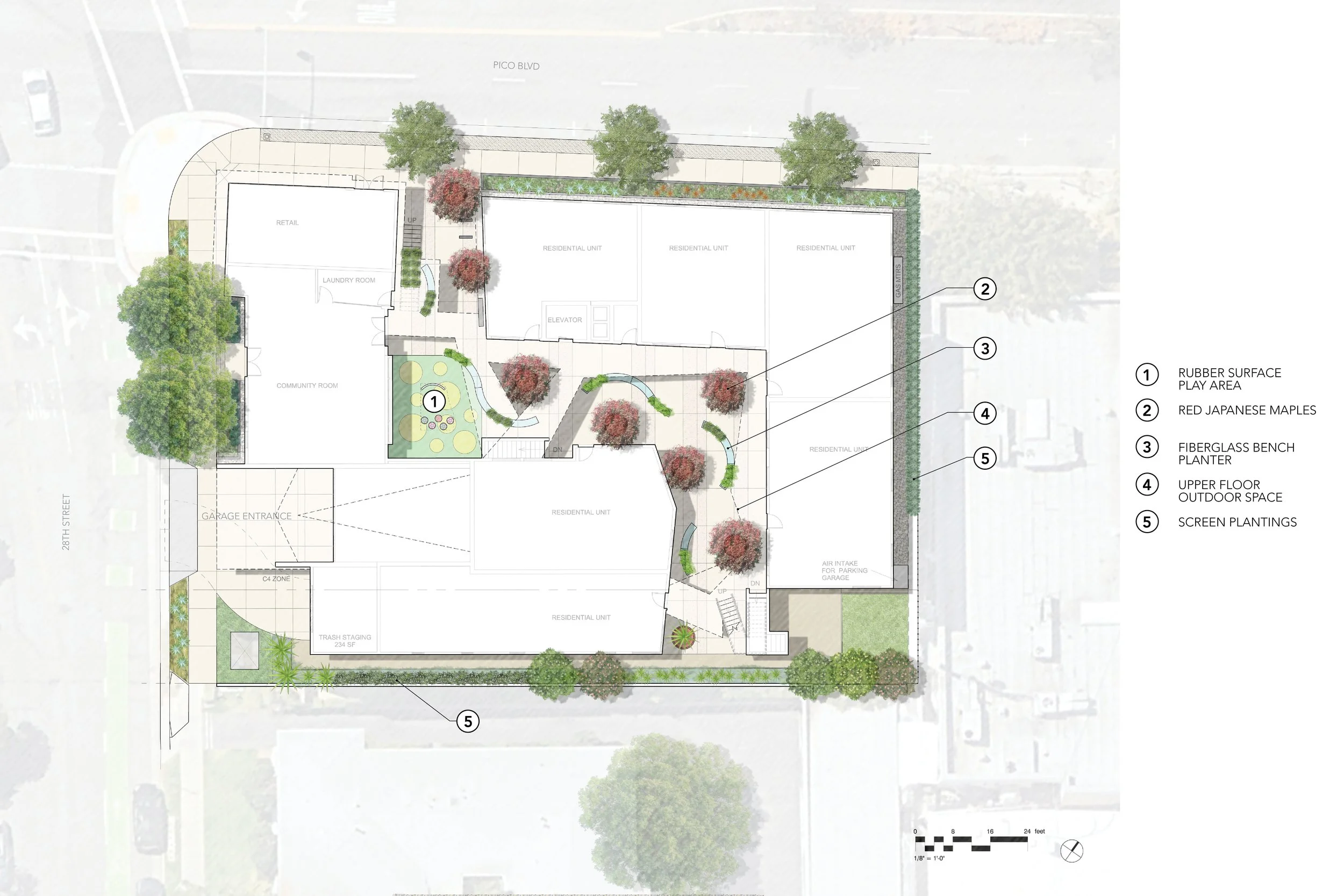 This project provides 100% affordable housing at the corner of Pico Boulevard and 28th Street for the nonprofit organization Community Corporation of Santa Monica. This mixed-use project accommodates 33 units above retail and community space organized around an engaging courtyard. The project strives to contribute to the life of its residents, neighbors and the City, by providing a pedestrian-friendly urban façade to enliven the corner of Pico Boulevard and 28th Street. An “Alice in Wonderland” courtyard was created on a busy corner property on Pico Blvd with giant flowerpots, Japanese maples — trees that provide abundant color — and bamboo. The courtyard optimizes social interaction and incorporates a playful array of bridges, walkways and stairs. Aligned with the entrance at Pico, a social hub is created at the heart of the courtyard surrounded by the community room, laundry, main stairs and elevator that surround a children’s play area. Along Pico privacy was created by planting three heights and layers of plants, including Pittosporum, Rosemary, and Phormium. In the small ground-floor lawn area, citrus, figs, aloe vera, and pomegranate were planted. On the rooftop terrace, the trees in the surrounding neighborhood become a borrowed landscape. Close collaboration with the city of Santa Monica established appropriate street trees. Throughout the complex, social spaces were created by specifying unusual and vibrant plant materials.
